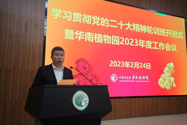 园党委书记/副主任魏平首先作了关于学习贯彻党的二十大精神培训班开班动员报告。他强调,党的二十大报告明确指出了我们党在新征程上举什么旗、走什么路、以什么样的精神状态、朝着什么样的奋斗目标继续前进,擘画了以中国式现代化全面推进中华民族伟大复兴、全面建成社会主义现代化强国的宏伟蓝图。学习贯彻党的二十大精神是当前和今后一个时期全党全国的首要政治任务。魏平就组织开展好专题学习培训班提出了五点要求。一要充分认识学习宣传贯彻党的二十大精神的重大意义,努力在全面学习、全面把握、全面落实上下功夫,切实把思想和行动统一到党的二十大精神上来;二要牢牢把握新时代十年伟大变革的重大意义,深刻领悟“两个确立”的决定性意义,增强“四个意识”、坚定“四个自信”、做到“两个维护”,确保在政治立场、政治方向、政治原则、政治道路上同党中央保持高度一致;三要牢牢把握习近平新时代中国特色社会主义思想的世界观和方法论,准确把握“教育、科技、人才”的辩证关系和发展逻辑,不断夯实运用党的创新理论谋划工作、开创新局的能力,扎实推动华南植物园各项事业发展;四要自觉对标对表中央及院党组的部署要求,对标定位,深入思考,切实将学习贯彻党的二十大精神与院党组新部署新要求转化为团结带领广大党员干部和科技人员干事创业的工作实效;五要发扬斗争精神,以伟大自我革命引领伟大社会革命的重要要求,深化全面从严治党部署要求,做好巡视整改“后半篇文章”,为推动华南植物园高质量发展提供坚强政治保证。