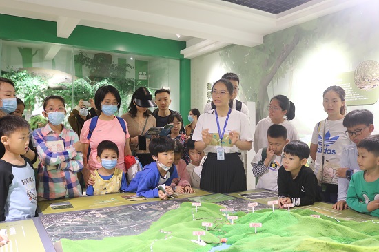接着,在戴玉映老师的带领下,参与者们走进鼎湖山自然教育中心了解保护区的发展历史、地理位置、生态资源、生态保护措施和科学研究成果等。期间,戴玉映利用沙盘模型让大家“窥见”鼎湖山保护区的全貌,还特别介绍了鼎湖山保护区历年来的重大事件、历史年鉴、重点珍稀保护动物标本以及以自然保护区为研究地点的科研成果,参与者尤其对打破经典传粉机制的黄花大苞姜产生了浓厚兴趣。