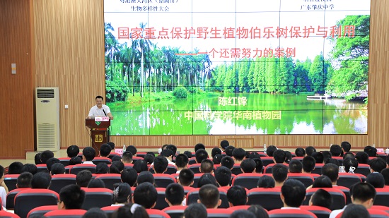 另一位是来自广东省植物学会秘书长、华南植物园陈红锋研究员,他为肇庆中学作了题为“国家重点保护植物伯乐树的保护和利用研究”的科学报告。陈红锋博士用风趣幽默的语言将10多年来所做的科研工作与知识积累向500多名师生娓娓道来,内容包括生物多样性与保护生物学的概念和意义,以及伯乐树的全方位解读,包括这个国家二级重点保护野生植物的性状特征,以及从伯乐树的种群生态学、生殖生物学、传粉生态学、遗传多样性与基因组学等方面全面揭示了该物种的濒危机制,并提出了科学的保护措施与方法。