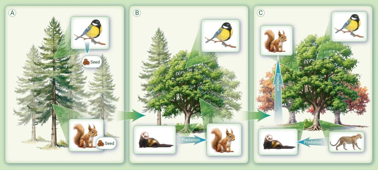 中国科学院华南植物园任海研究员等科研人员建议对中国划为生态公益林的人工林改造时,可以向生态、经济、社会多种功能效益最大化转变,不断提升生态系统多样性、稳定性、持续性。可以调整林冠层种类、林下种类,将外来种更换成乡土种等,再通过种子传播、多层化、多样化实现再野化。在人工林改造为近天然的生态公益林的过程中,要从以植被恢复为主,转向注意动物群落的恢复,恢复森林生态系统的营养级,最好是能恢复森林群落中的顶级动物(图1)。在山水林田湖草沙治理过程中,应该利用系统的观点,将工作重点从生态系统尺度转向景观尺度的恢复,注重生态系统间的流通性,恢复生态连通性。探讨基于自然的恢复,提升生物多样性保护和恢复水平,增加人工林减缓气候变化的韧性。在此过程中,要加强科技创新工作,包括乡土植物、高价值植物的研究;要综合考虑动物的就地保护、迁地保护、回归等整体保护;要参考食物链的结构恢复森林中的动物营养级,加大动物生态人才的培养,通过空间规划实现景观尺度的生态廊道的恢复。