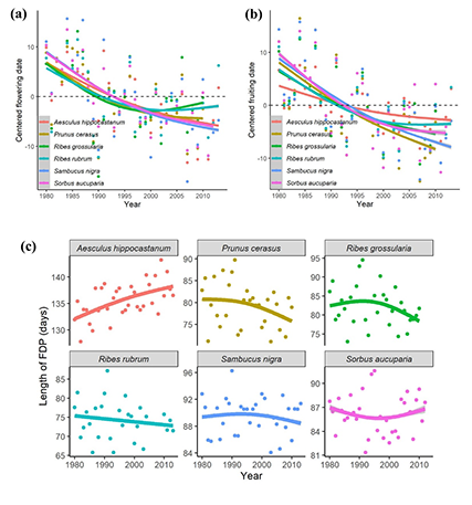 通过利用历史物候观测资料(1980-2013年),中国科学院华南植物园马倩倩副研究员和合作者分析了6种常见温带木本植物的开花和结果物候期和果实发育期时长对气候变暖的响应,取得以下发现:所有物种的开花和结果时间均随气候变暖而提前。相应地,整个果实发育期表现为前移趋势。然而,同一物种开花和结果时间的提前速率并不一定相等,使得果实发育期时长随变暖呈现三种不同变化:延长、缩短或不变。这与植物生长季随变暖普遍延长的现象不同。果实发育期的差异化响应表明植物对于气候变暖采取了不同的繁殖物候响应策略。由此可能会改变物种适应性,进而影响森林生态系统结构和功能。