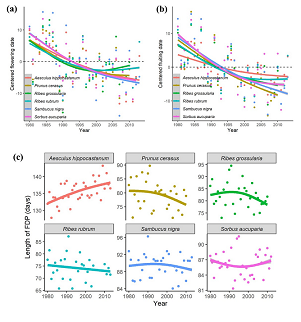 通过利用历史物候观测资料(1980-2013年),中国科学院华南植物园马倩倩副研究员和合作者分析了6种常见温带木本植物的开花和结果物候期和果实发育期时长对气候变暖的响应,取得以下发现:所有物种的开花和结果时间均随气候变暖而提前。相应地,整个果实发育期表现为前移趋势。然而,同一物种开花和结果时间的提前速率并不一定相等,使得果实发育期时长随变暖呈现三种不同变化:延长、缩短或不变。这与植物生长季随变暖普遍延长的现象不同。果实发育期的差异化响应表明植物对于气候变暖采取了不同的繁殖物候响应策略。由此可能会改变物种适应性,进而影响森林生态系统结构和功能。