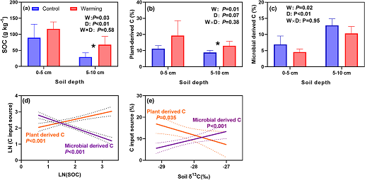 中国科学院华南植物园恢复生态学任务团队基于日本广岛的长期土壤增温野外控制实验平台(>10年),系统地研究了长期土壤增温对东亚季风林土壤有机碳库大小、结构和稳定性的影响,从微生物转化和矿物保护的角度探究了增温影响土壤有机碳库的生态学机制。研究发现,10年的持续温显著增加了0-10cm土壤有机碳含量,增温导致土壤有机碳含量的增加主要来自植物,植物来源碳(木质素和酚类物质)增加60%;而微生物的贡献较低,微生物来源碳(氨基糖)降低27%。增温对土壤有机碳库稳定性的影响整体不显著。研究结果表明,在温度升高的背景下,东亚季风林土壤仍可以持续固持有机碳。本研究结果与其它区域的不一致性也指出未来亟须加强不同生物区系的对比研究,深入探究植物来源碳和微生物来源碳调控土壤有机碳库响应温度升高的规律和驱动机制。