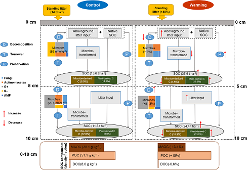 图2 长期增温影响土壤有机碳含量和组成的微生物转化和矿物保护途径