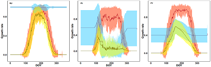 图:日平均生长率的年内变异性,由温度(红色)和水分(蓝色)控制,平均生长率(黄色)。阴影区域表示平均值±标准差。