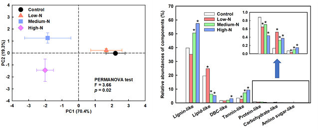 图1:长期氮添加对南亚热带森林土壤DOM光谱性质(左图)和不同功能组分相对丰度(右图)的影响。