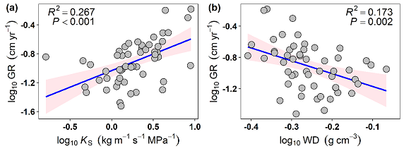 图 1 枝条导水率(a)、木材密度(b)与树木生长率之间的关系