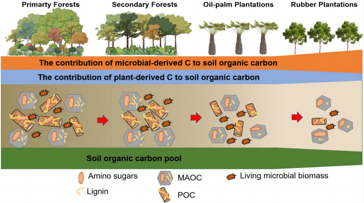 图-1:热带森林转变下土壤有机碳中氨基糖与木质素的积累受功能碳库组分的调控作用。