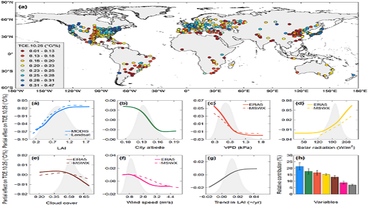 本研究利用Landsat卫星反演的城市树木覆盖度和地表温度数据在全球806个大城市中对比了10%树木覆盖度、25 ℃气温条件下的树木降温效率。较高的降温效率出现在近北美西海岸、北美东北部、中西欧和日本地区。较低的降温效率出现在中美洲、地中海沿岸、中国北方以及南半球地区。机器学习模型结果显示,降温效率的全球异质性主要受到LAI等植被生理特性、城市反照率等人为管理相关变量以及VPD、短波辐射等气象要素的驱动。自2000年以来,研究发现全球超过90%的城市表现出树木降温效率的上升趋势。基于遥感观测证据和城市生态水文模型模拟的结果表明,降温效率上升的部分原因是近年来LAI的普遍增加以及部分地区短波辐射的增强,此外城市相对湿度下降导致VPD的增加以及城市反照率的下降也会贡献降温效率的上升。