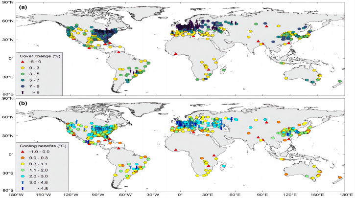 图2. 2000-2015年期间全球城市树木覆盖度的变化及其带来的城市地表温度下降