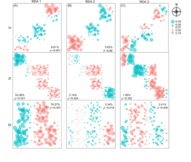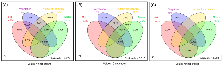 图2. 空间结构和环境变量对三个岛屿土壤种子库空间分布格局的影响