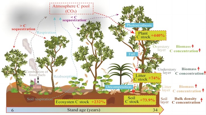 中国科学院华南植物园鼎湖山站博士生李旭和博士后Luis Carlos Ramos Aguila在刘菊秀研究员的指导下,依托广东省龙眼洞林场,通过测量红锥人工林6、10、15、25和34年林龄的乔木层、林下植被层、凋落物层和土壤层碳储量,发现乔木层、林下植被层、凋落物层、土壤层和红锥林生态系统的碳储量随林龄稳步增加。6、10、15、25和34年林龄的红锥人工林乔木层碳储量分别为29.17、56.18、85.60、132.19和157.79 Mg ha-1;生态系统总碳库分别为68.11、106.11、136.13、187.34和226.14 Mg ha-1。从6年到34年林龄的红锥人工林乔木层碳储量增加了440%,而生态系统碳储量增加了232%。同时,6-10、10-15、15-25和25-34年林龄间隔的固碳速率分别为675.28、588.35、465.98和284.39 g m2 year-1。研究表明,尽管红锥人工林随林龄的固碳速率降低了,但活生物量碳和土壤碳仍在继续积累。该研究揭示了红锥人工林植物和土壤随林龄的固碳潜力,为华南地区人工林恢复和固碳能力评估提供参考依据。