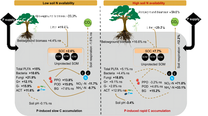 基于陆地生态系统536项相关研究进行整合分析探究了磷供给与土壤碳储存的关系,发现磷供给增加促进土壤有机碳的储存, 并随着土壤氮有效性的增加而增加。在土壤低氮有效性 (C:N ratio > 16)情况下, 磷添加促进植被生产力从而促进植物碳的输入,同时也促进微生物活性(即增加微生物生物量),促进土壤呼吸,增加土壤碳的损失,这种土壤碳的损失将会抵消植物碳输入的增加,从而使得磷添加对土壤有机碳的影响出现不变或负效应的可能。在土壤高氮有效性(C:N ratio ≤ 16)情况下, 磷添加极大促进植被生产力,增加植物碳的输入,同时对微生物活性没有影响,降低土壤土壤呼吸,降低土壤碳损失,从而增加土壤碳储存。导致上述现象的可能原因是在磷添加下,土壤高氮有效性为微生物提供了更多的氮,降低微生物为获取氮的碳矿化。本研究强调了基于土壤磷极大的空间变异性,未来预测土壤碳储存的模型中需要考虑土壤氮的有效性。